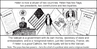 The Roman Catholic Church, with all its ramifications [sic] throughout the world, forms one vast organization, under the control, and designed to serve the interests, of the papal see. Its millions of communicants, in every country on the globe, are instructed to hold themselves as bound in allegiance to the pope. Whatever their nationality or their government, they are to regard the authority of the church as above all other. Though they may take the oath pledging their loyalty to the state, yet back of this lies the vow of obedience to Rome, absolving them of every pledge inimical to her interests (p.555)This sort of thing is the reason why Canadian police considered investigating whether distribution of this book is a hate crime. Nevertheless it points up the book's second redeeming feature. I'd always thought that Chick tracts were the crappiest form of religious publishing. I was wrong. Chick tracts are also bargain-basement anti-Catholic bigotry, but they're several several hundred pages shorter than America in Prophecy.